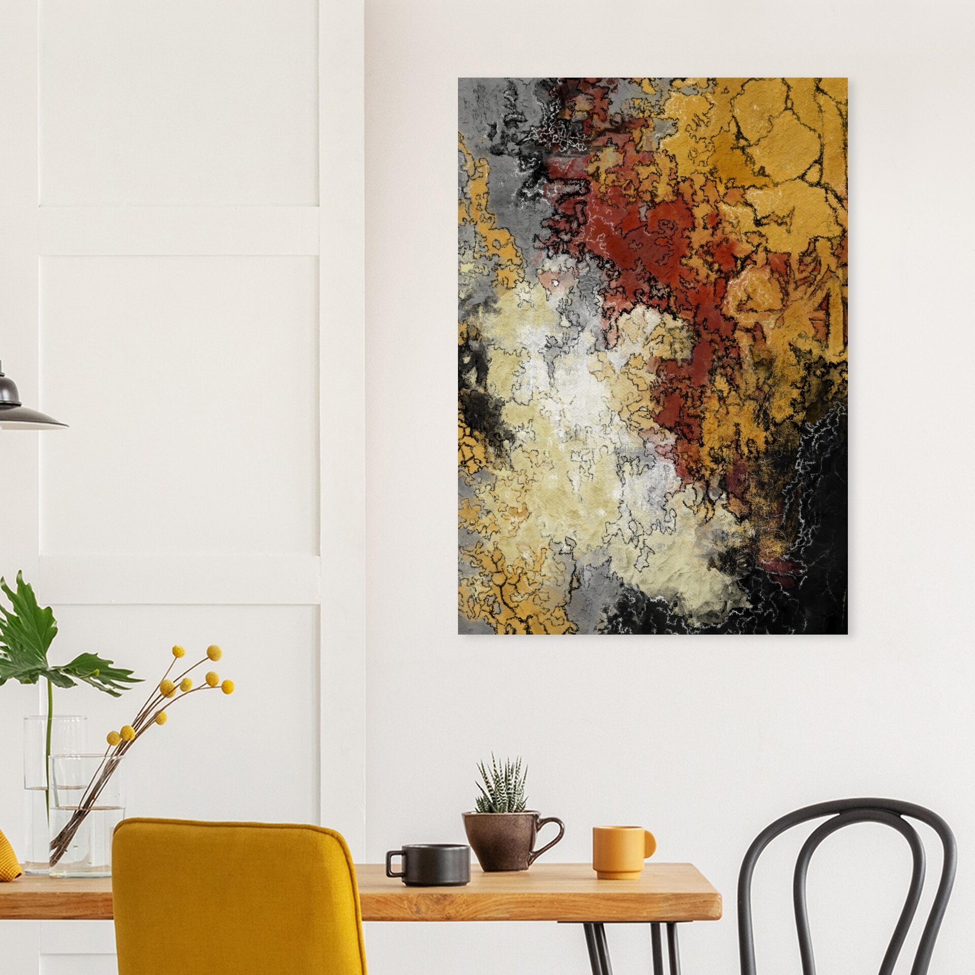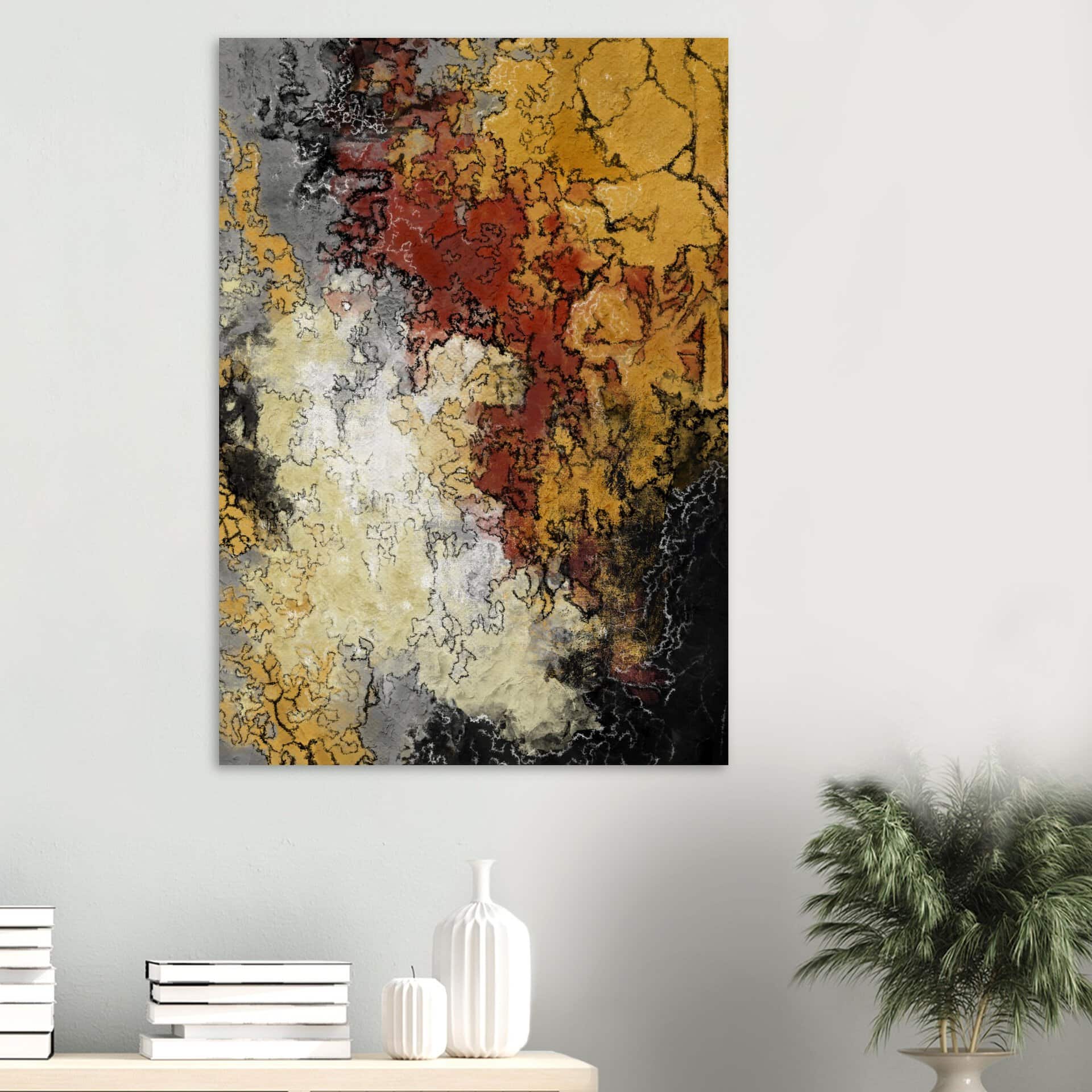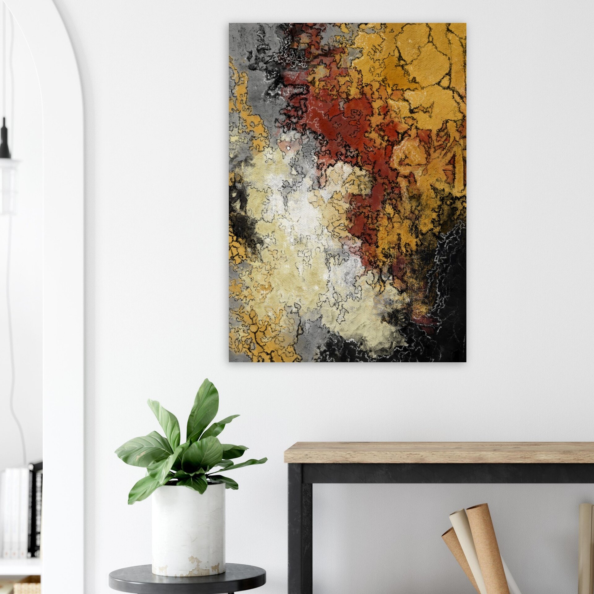 “Golden Chaos” By Manar Mouafak is a striking balance of brilliance and disruption. Explosive bursts of gold emerge from the dark, symbolizing resilience amid uncertainty. This artwork resonates with anyone drawn to contrasts, light against shadow, order within disorder, making it a radiant statement piece for modern interiors.