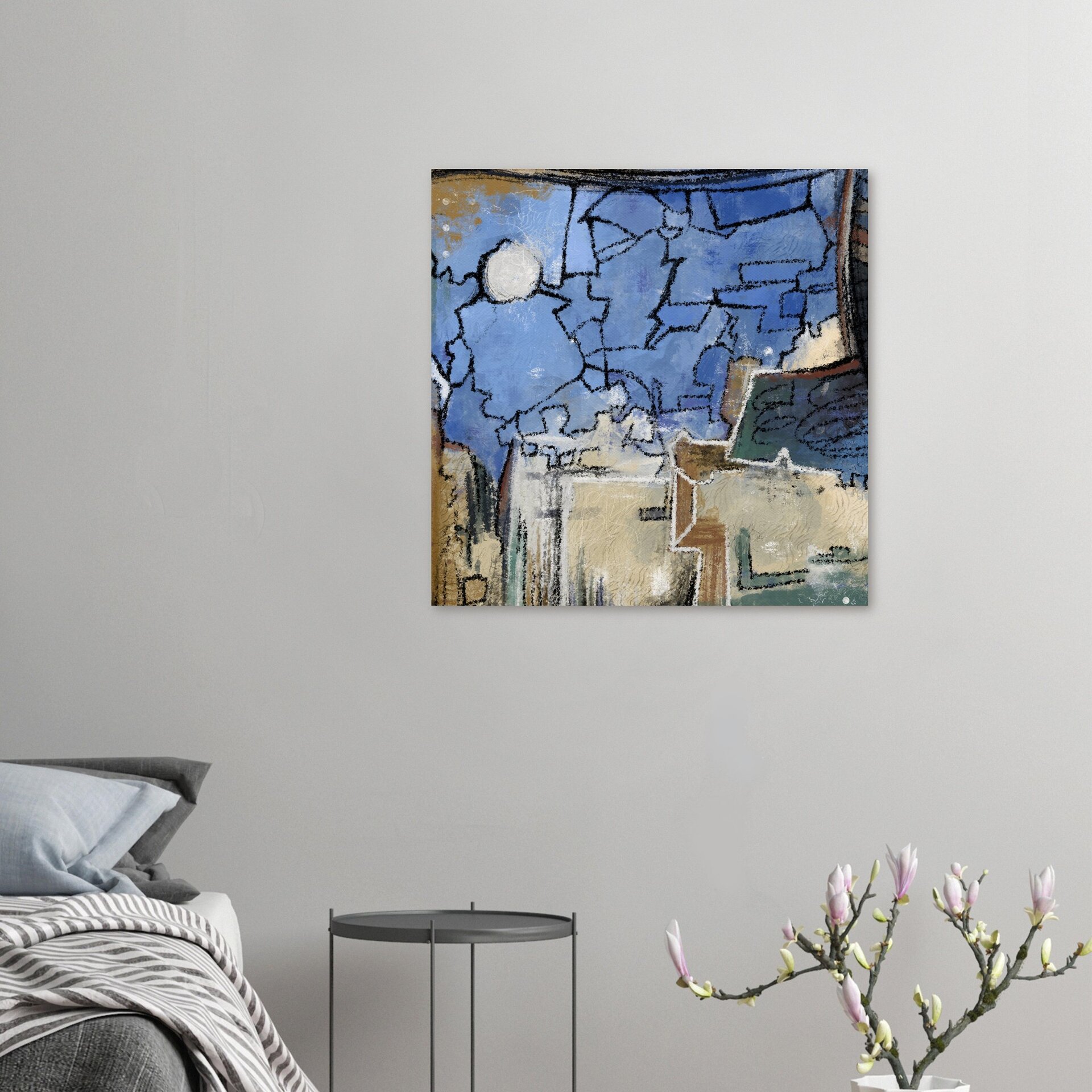 “Memories” By Manar Mouafak is poetic abstract that speaks in fragments of form and texture. Soft blue expanses meet earthy tones, traced with expressive black lines that hold the composition together like fragile recollections. The piece evokes both presence and absence, a reflection of how memories shift and reshape over time. With its layered depth and quiet elegance, it offers a contemplative statement for any space, resonating with those who value art that leaves room for personal meaning.